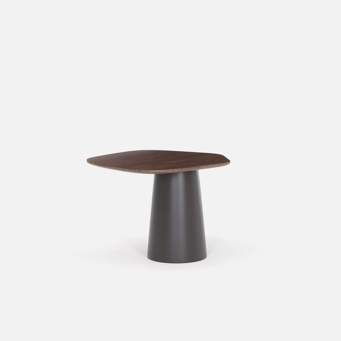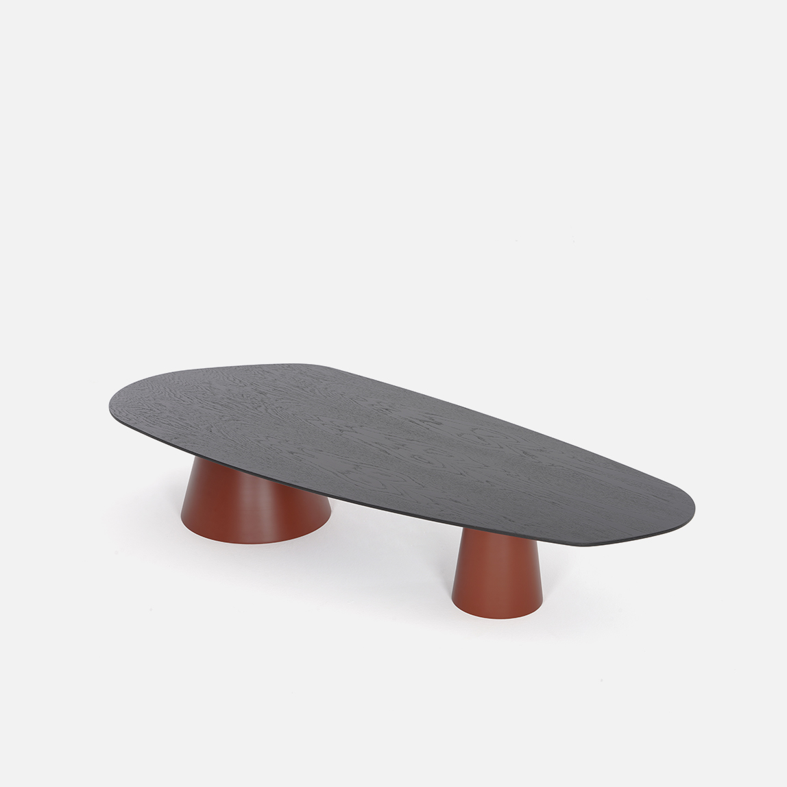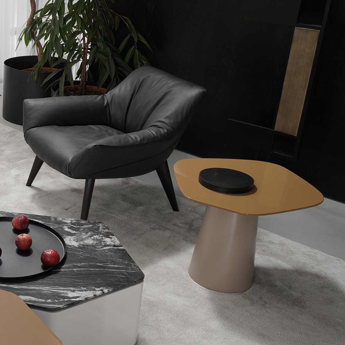 The material and chromatic interplay of the geometric elements increases the subtle yet theatrical impact of these multi-use tables, appropriate for both the day and night areas of the home