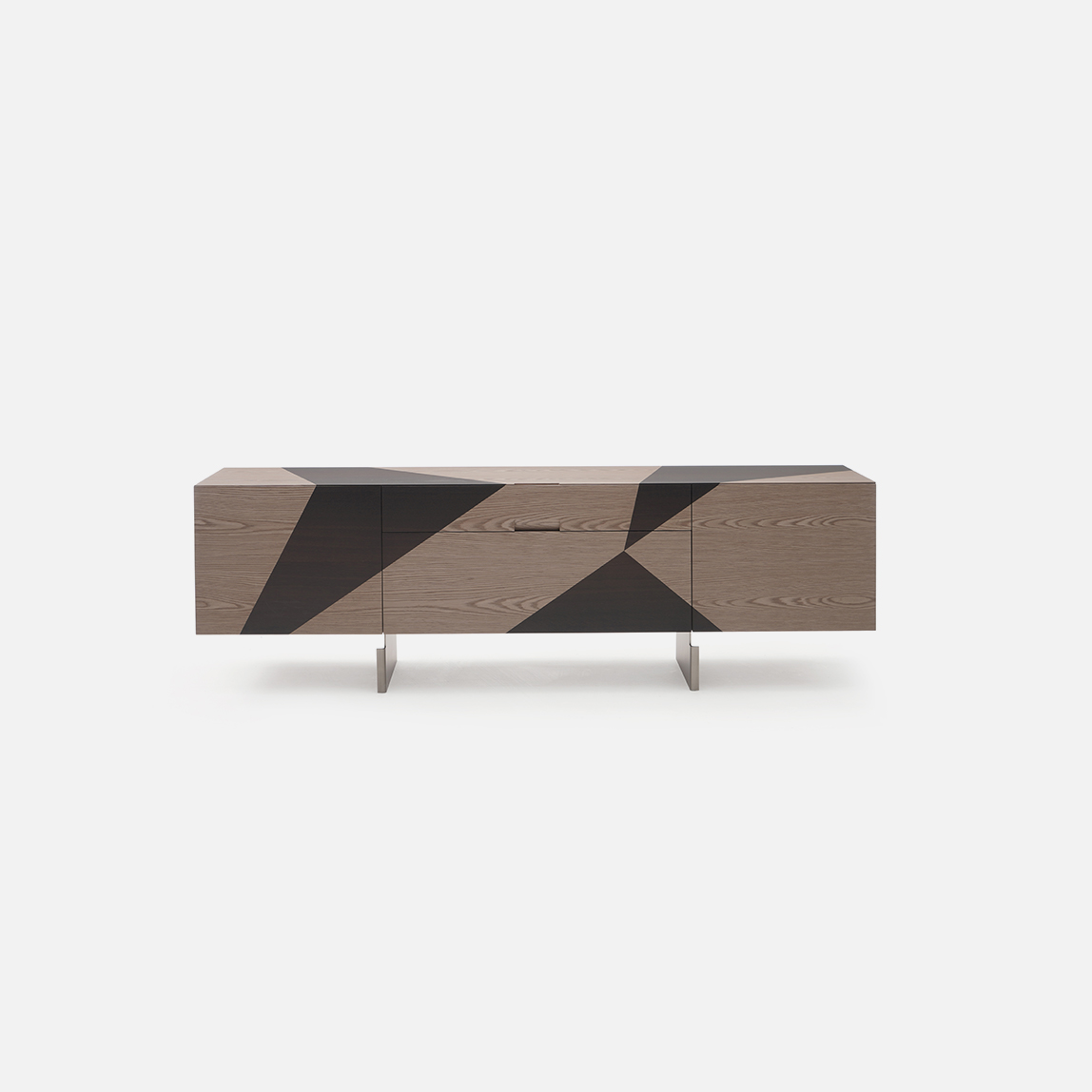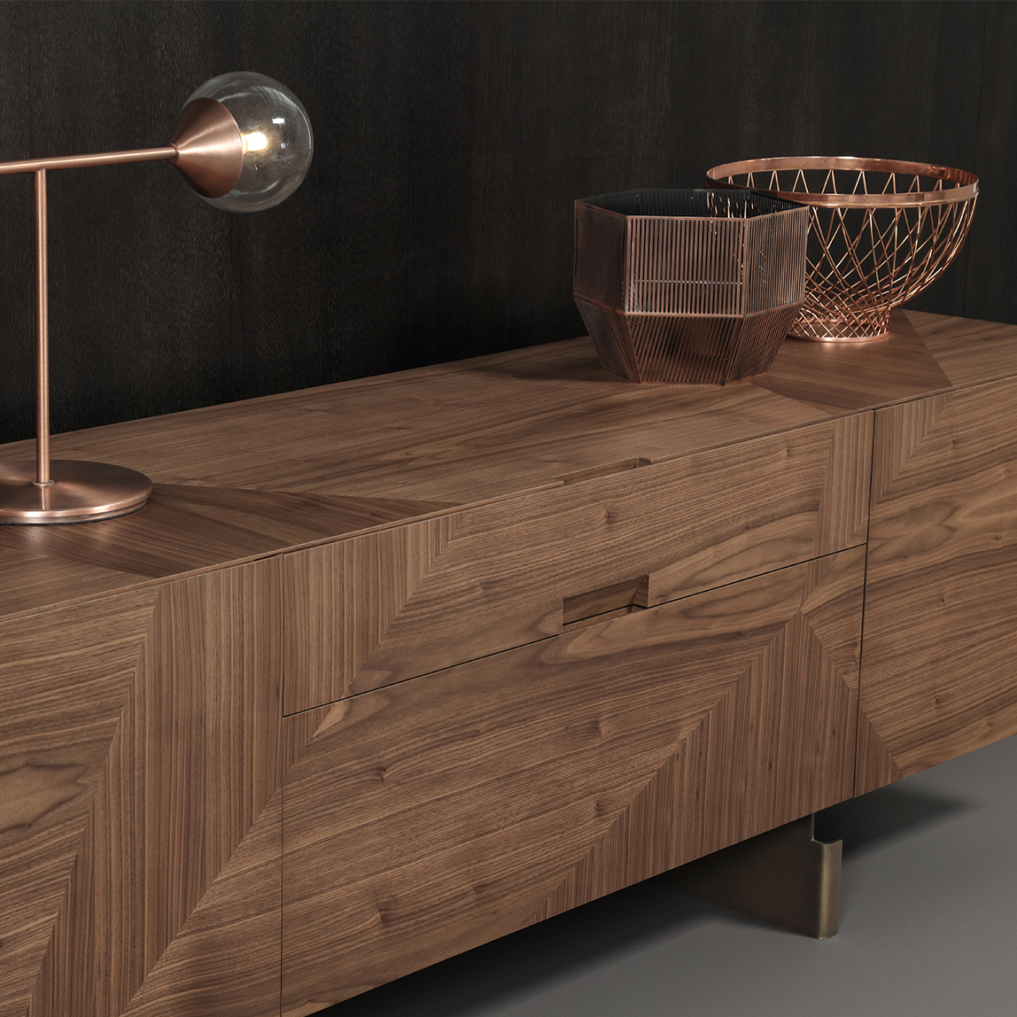 Ostia sideboard is as distinctive as it is surprising, with its coincidental horizontal, vertical and inclined patterns that reinterpret the natural texture of the tree, and its cleverly designed cubic form.