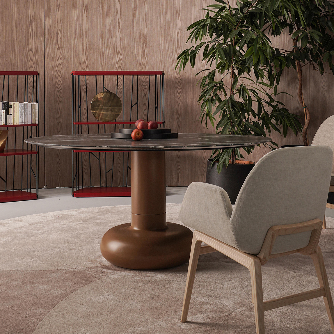 The Tirreno dining table reinterprets the historical column and floor relationship and brings it to the present. In addition to block marble for legs, lightweight and extremely durable fiberglass options; Lacquer and various natural wood veneer options are available for the top.