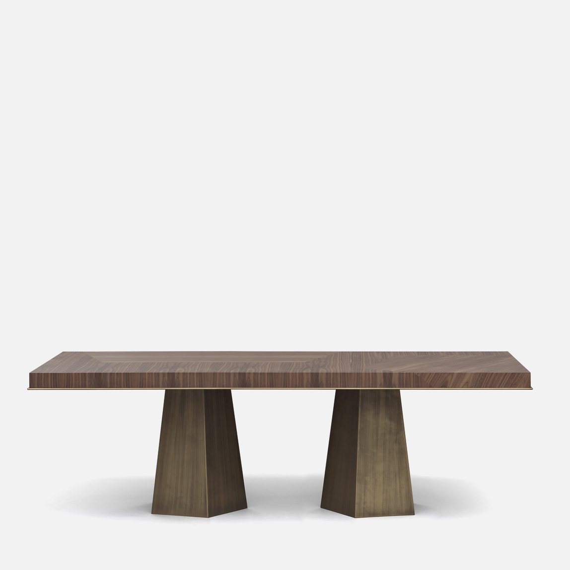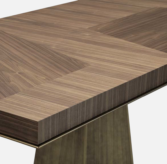 Levanzo yemek masası, Mare Nostrum koleksiyonundaki diğer ürünler gibi hem zarif hem davetkar ortamlar yaratıyor. Levanzo’nun görkemli kalın ahşap tablasının ince ve dekoratif alt çerçevesiyle uyumu, metalik cilalı sütun ayakları ile birleşerek gösterişli bir kontrast yakalıyor.